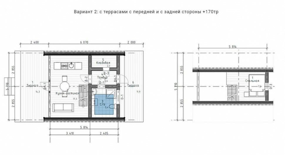 ✅ Может быть выполнен со входом и террасой спереди, или входом и террасой спереди и сзади.